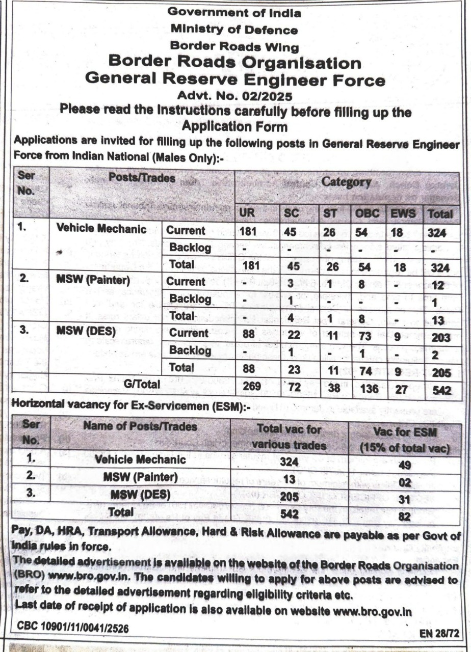 BRO GREF Various Post Notification 2025 | सीमा सड़क संगठन से विभिन्न पद के लिए भर्ती जारी |