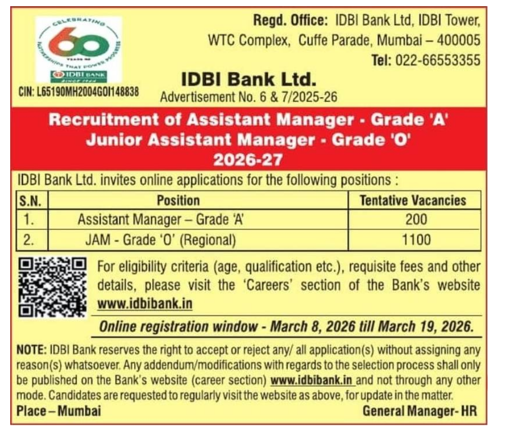 IDBI Bank JAM Vacancy Details 2026